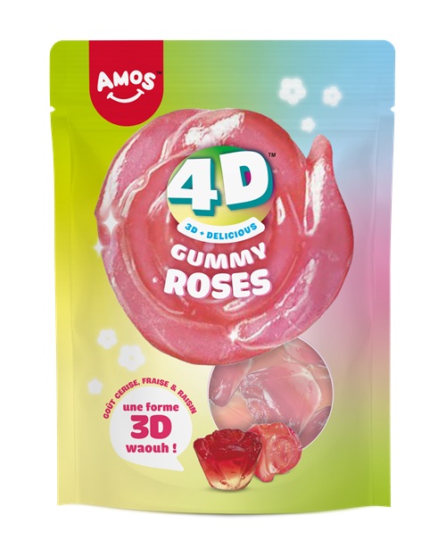 Ontdek een bloeiende tuin met de 4D Roses fruitige gummisnoepjes van AMOS. Deze roosvormige snoepjes zijn gevuld met een sappige aardbei-, kersen- en druivensapvulling en bieden een unieke smaakbeleving. De zachte textuur en het realistische 3D-ontwerp zullen zowel kinderen als volwassenen verrassen.