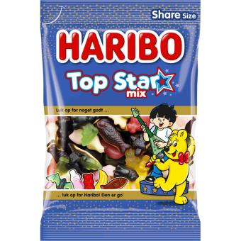 Met Haribo Top Star Mix haal je de Deense Haribo-wereld in huis. Of het nu fruitgummies, drop of marshmallows zijn er is voor ieder wat wils en de inhoud van elke zak is uniek, omdat het assortiment willekeurig wordt samengesteld. Verwen fruitige flesjes, zwarte visjes, kromme bananen of Goldbears op marshmallows en laat je verrassen door de kleurrijke variatie.